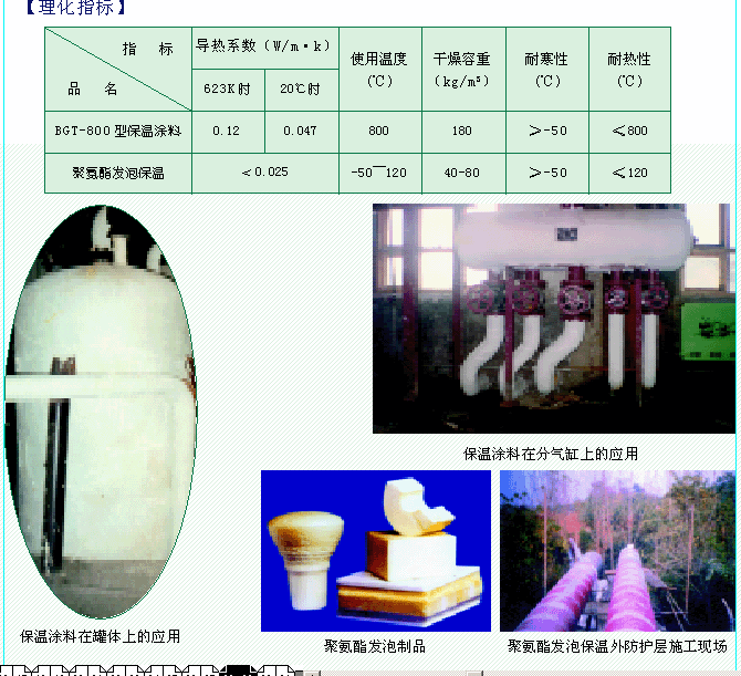 BGT-800型復(fù)合硅酸鎂保溫涂料是一種新型無機(jī)微孔網(wǎng)狀輕質(zhì)高效保溫材料,產(chǎn)品屬于不定型膏狀,施工方便、絕熱性能好、不開裂、不粉化、不脫落??蓮V泛應(yīng)用于化工、電力、冶金、石油等行業(yè)的高溫管道,尤其適用于異型熱力管網(wǎng)及閘、閥、球體的保溫隔熱。經(jīng)檢測,其各項性能指標(biāo)均優(yōu)于其它傳統(tǒng)保溫材料。